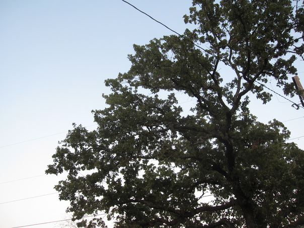 A big tree with fresh green leaves and lots of stems and also a cable passing across that tree