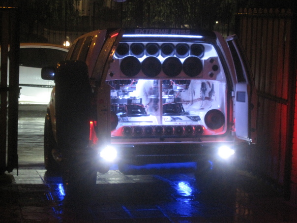 A van sitting in a garage with its rear door open showing the inside of the van.