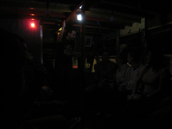 This picture features a man standing up amongst people sitting in a dark room.
