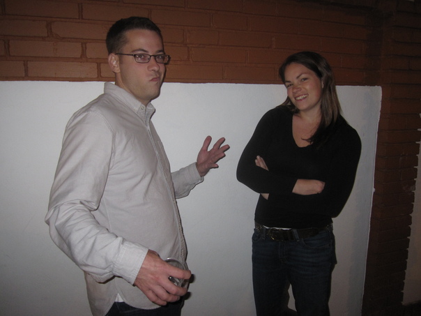 A man in white shirt and black pants talking to a smiling lady in black top and blue jeans