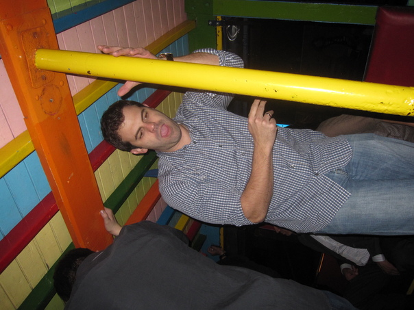 A brightly colored room with a man attempting to pole dance.