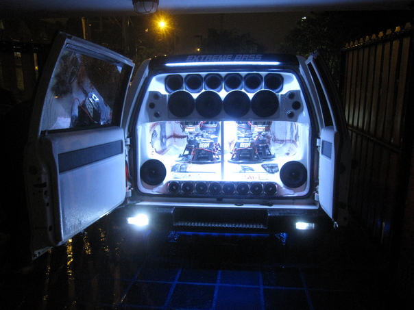 A large van loaded with a big sound system and branded with the name "Extreme Bass."