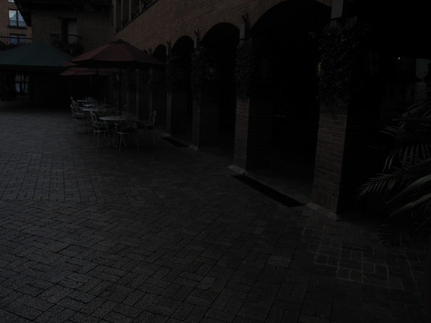 A paved courtyard at dusk the archways have green plant life clinging to each side.