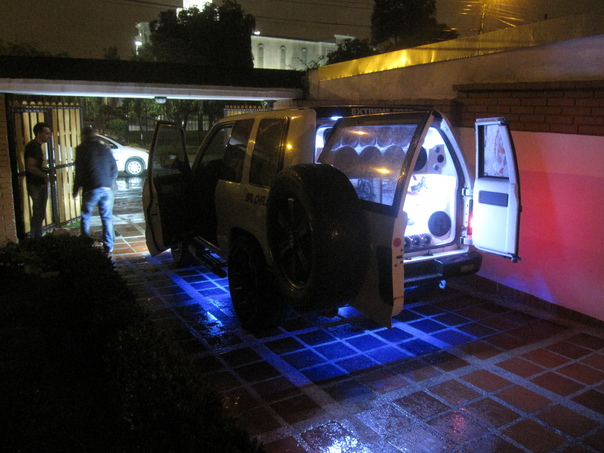 A modified vehicle, filled with lights and several speakers, is sitting on a driveway.