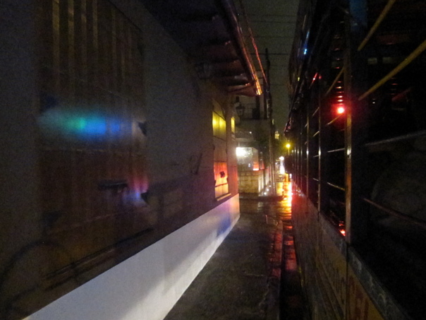 Many lights are reflected off the walls and wet streets in a city at night.
