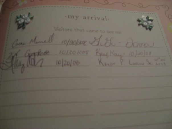 Friends sign a book so that people can go back and look to see who was here on my arrival.