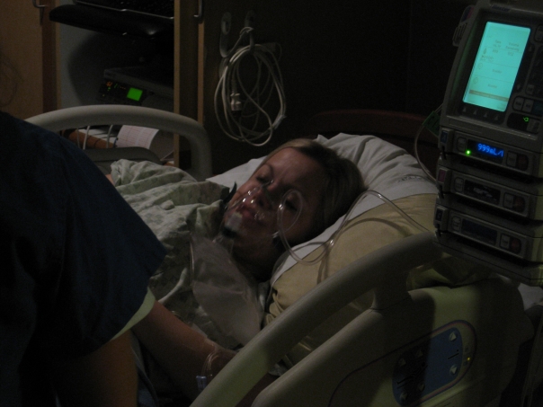 A young, blond woman is lying in a hospital bed while using an oxygen mask.