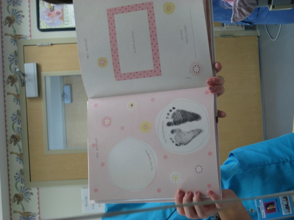 A hospital nurse presents a scrapbook containing a newborn baby girl's footprints and a certificate.