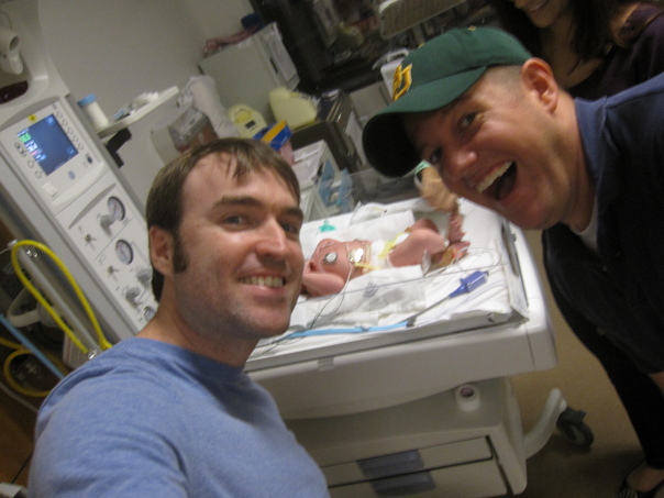 Two men are beaming with smiles in front of a new born baby at the hospital.