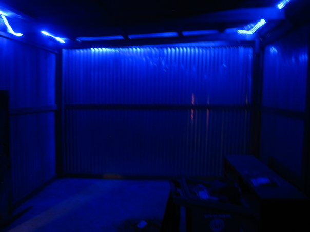 The outside porch is bathed in deep blue from string lights.