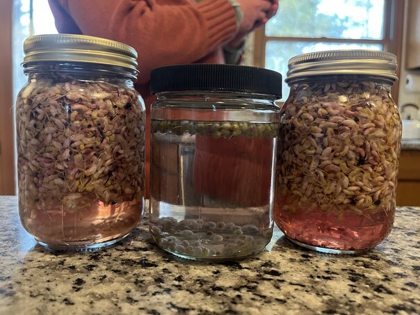 Meanwhile, Claire and I picked a huge bundle of Red Buds and Grape Hyacinth and used them to infuse a variety of vodkas.