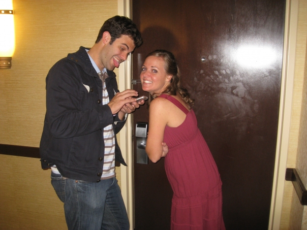 A middle aged to younger couple, a man and lady, that are standing outside a hotel room. She is lookign at the camera smiling and he is looking at his phone but making a funny face for the camera.