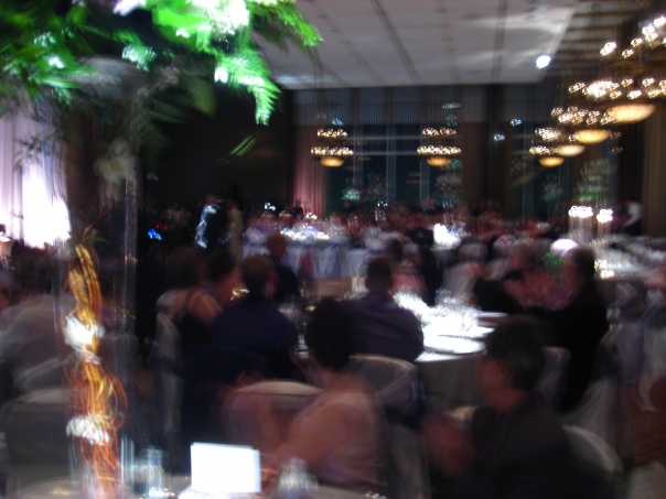 A blurry photo of a large group of people sitting at round tables looking over and clapping.