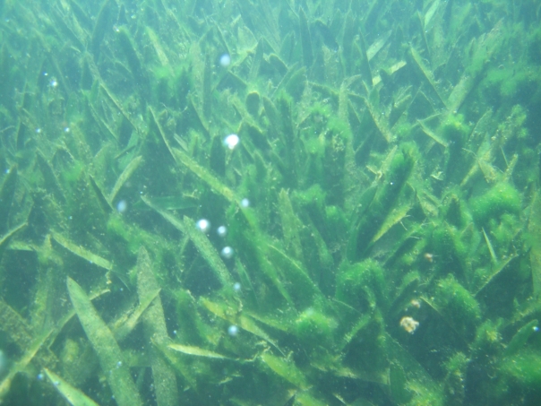 Under water vegatation with other organisms floating above the grass.