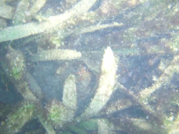 There are green and brown leaf-looking plants which appear to be underwater and grainy.
