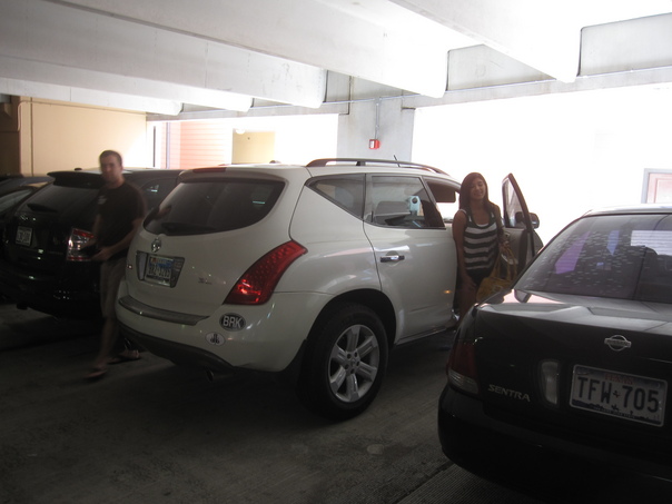 A woman in a striped top exits from the passenger side of a white van that is parked in an open-air garage.