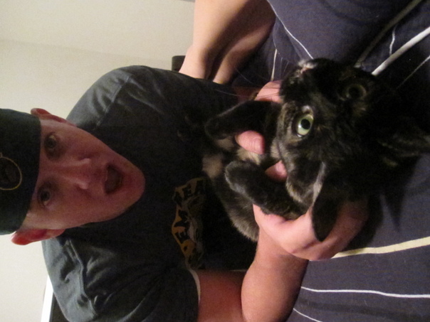 A man wearing a black shirt and cap is playing with a black cat.