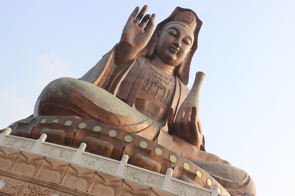 This is a photograph of an outdoor statue, possibly bronze, of Buddha.