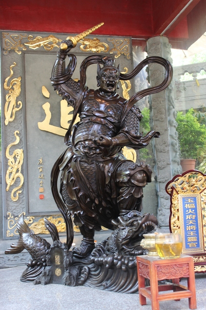 a statue holding a iron rod in his hand behind the table