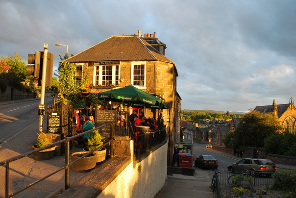 This picture shows a rustic café in a hilly community with a church in the background right and a cloudy sky above rolling green hills in the far distance.