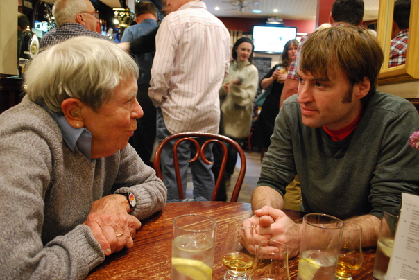 Two people are at a table with a number of drink glasses, and others gather in the background.
