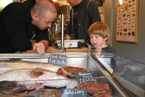A little boy talking to an adult about the freshly cut deli fish.