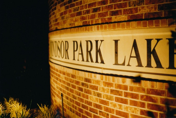 A spotlight illuminates a sign in a brick wall for Windsor Park Lane.