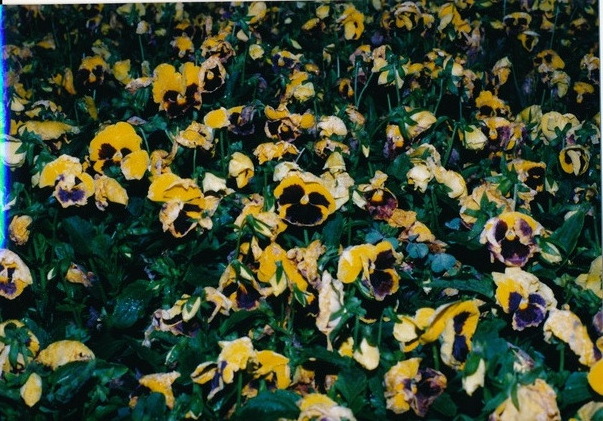 Lovely, multi-colored and yellow pansies are enjoying basking in the warm sun.