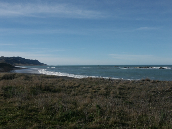 A coastal view, the water sweeps away in front of us, it is a sunny day and the edges of the waves are white, in front of us is dry grass.