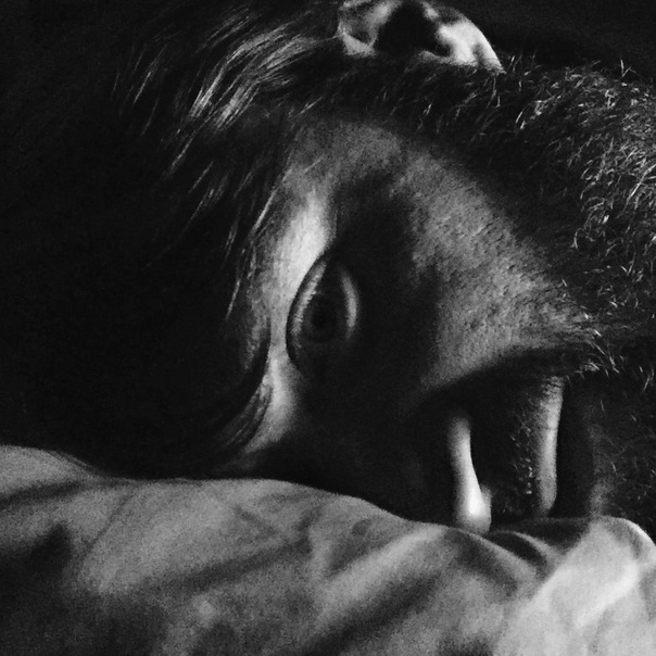 This is a haunting black and white photo of a young bearded man as he has just woken up.