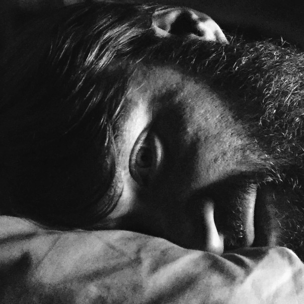 A black and white photo of middle age man with beard is lying on his bed.
