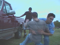 The two boys were wrestling on the grass as their friend watched from a bench nearby.