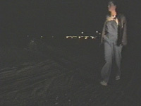 A white woman is dressed in overalls and a jacket while walking on a dark beach at night.