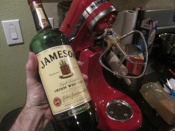Bottle of Jameson Irish whiskey next to a red Kitchen Aid Blender.