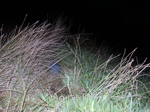 A night shot of dense reeds and grasses, lit up by a camera flash.