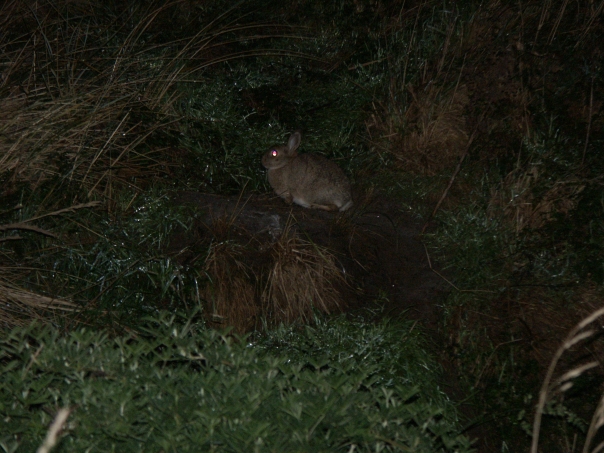 The photo is what looks to be a night time photo of a rabbit.
