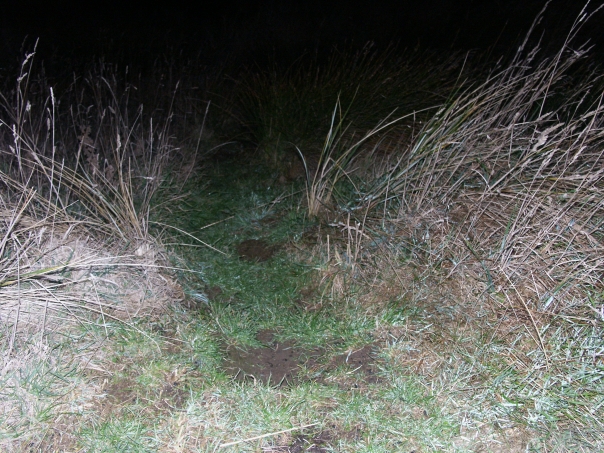 Brightly lit grass and weeds with spots of mud receding into a dark night.