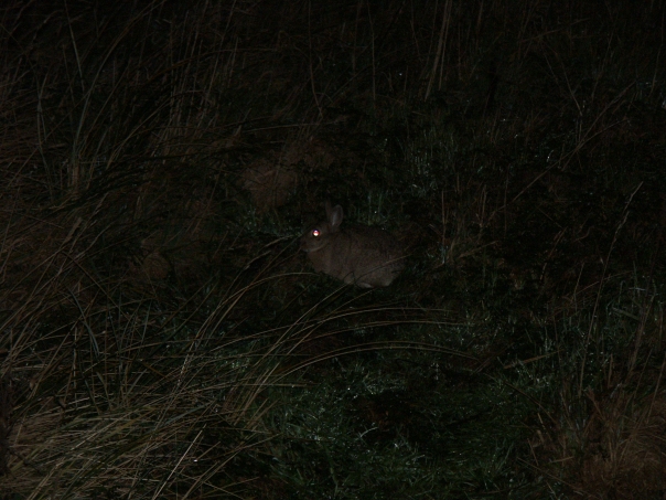 A rabbit in the field at night.