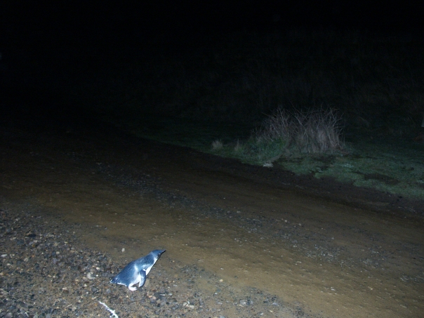 A lone penguin crossing a dirt road at night