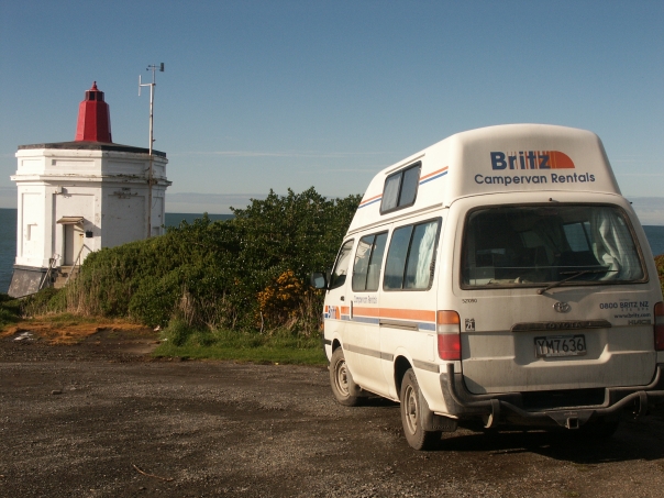 A Britz Campervan with the license plate YM7636 parked next to a coastline with a small lighthouse. The telephone number on the van reads 0800 BRITZ NZ. Presumably it is in New Zealand.