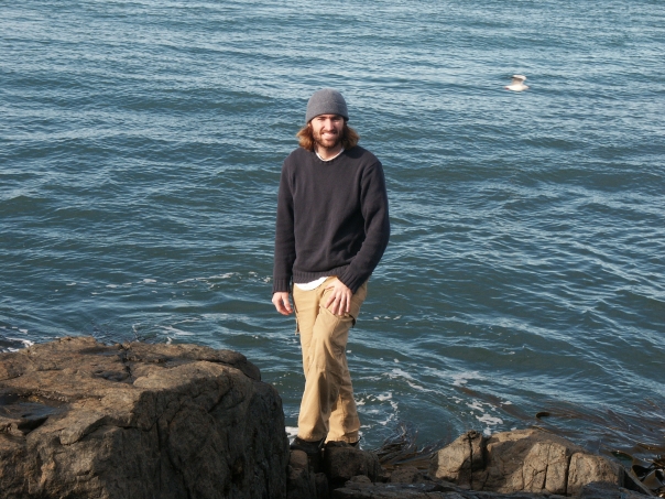 a man with a beard and long hair, wearing a beanie, standing on rocks in the water