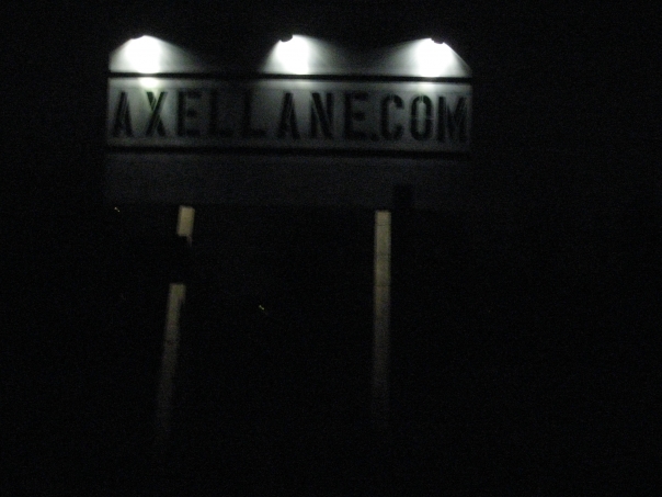 A white sign surrounded by darkness is illuminated with three lights and reads in bold black lettering AXELLANE.COM.