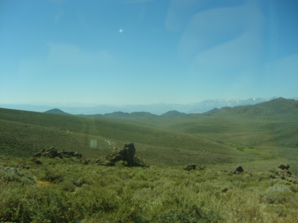 landscape with scrub brush and rocks in the foreground, olive green slightly rolling hills, with snow-capped mountains against a bright blue sky