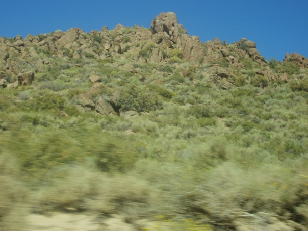 A picture probably taken from a moving vehicle with rocky cliffs in the background and blurred light green brush in the foreground.