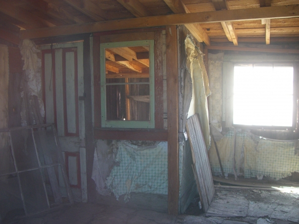 There is a partially completed room with a green window frame and a door.