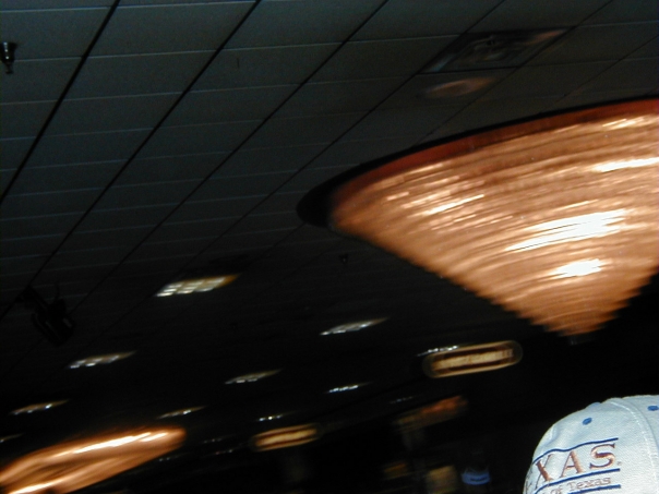 a photo that was taken very quickly, as the camera was moving. what you see is a ceiling and some glass chandeliers as well as the top of a baseball cap from the University of Texas.
