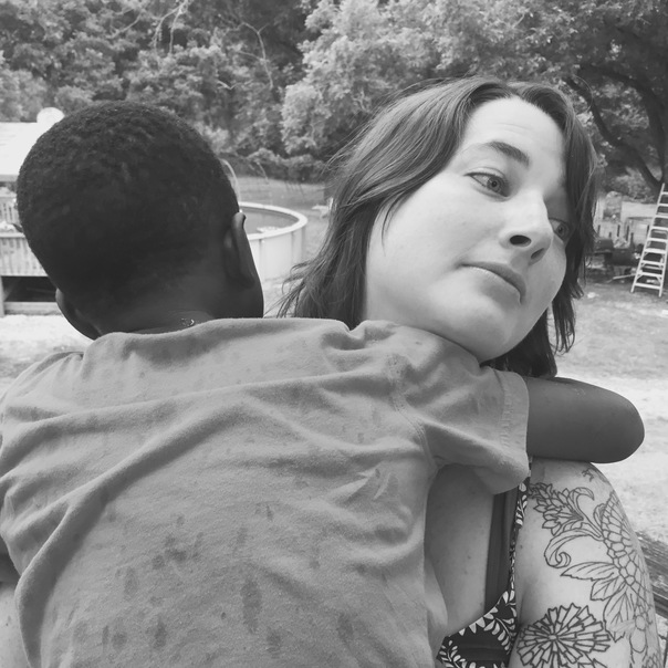 A brown haired young woman with tattoos gives a hug to a young boy.