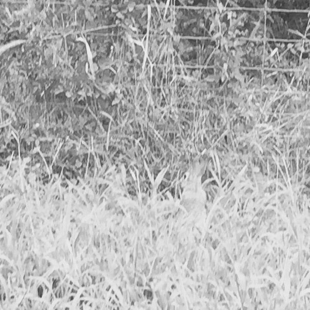 A black and white photograph of a rabbit sitting in tall grass in front of a wire fence.