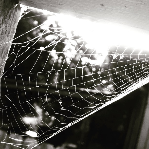 A cobweb is pierced by sunlight while adorning the edge of a door frame.