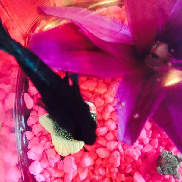 a black fish is swimming in a fish tank that has pink marbles at the bottom